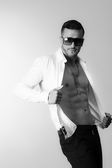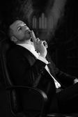 elegancki mężczyzna siedzi na krześle, trzymając pistolet w ciemnym tle