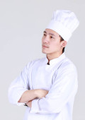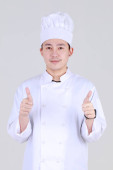 Portret studio strzał Azji profesjonalnej restauracji gotowanie kobiet szef kuchni w mundurze kucharza i szalik stojący uśmiechnięty spojrzenie na aparat gospodarstwa nierdzewnej garnka i pokrycie na białym tle.