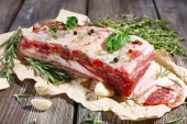 boczek surowy z przyprawami i pomidory na drewnianym stole