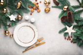 Nakrycie stołu świątecznego z dekoracjami wakacyjnymi na czarnym tle.