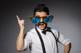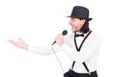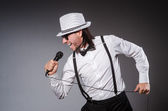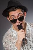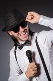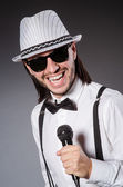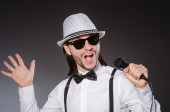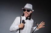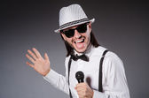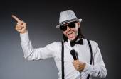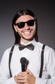 Śmieszny piosenkarz z mikrofonem na koncercie