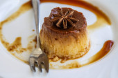 white plate with flan on wooden background, close up view