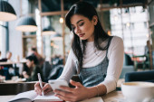 Zdjęcie "Niski kąt pozytywnej młodej kobiety freelancer mówi przez telefon komórkowy i robi notatki siedząc przy stole z laptopem i filiżanką gorącego napoju" może być wykorzystywane do celów osobistych i komercyjnych zgodnie z warunkami zakupionej licencji Royalty-free. Obraz jest dostępny do pobrania w jakości wysokiej rozdzielczości do 5760x3840.