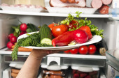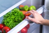 Mans ręka otwiera szufladę lodówki z warzywami. Zdrowa i właściwa żywność.
