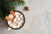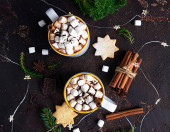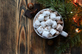 Kubek szklany z gorącym czekoladowym napojem kakaowym z pianką. Odbiór. Mroczne tło. Niski poziom. Zima, Boże Narodzenie i Nowy Rok koncepcja żywności i napojów.