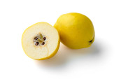Świeże owoce pigwy z połową izolowaną na białym tle