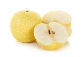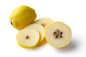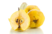 Świeże owoce pigwy z połową i plasterkami wyizolowanymi na białym tle