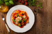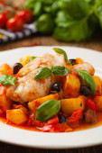 Tradycyjnie przygotowany dorsz w języku hiszpańskim. Podawany w sosie pomidorowym z gotowanymi ziemniakami, oliwkami i bazylią. Widok z przodu.