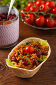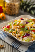 Modny obiad z płatkami zbożowymi, burakami i kurczakiem. Służył w misce na niebieskim tle. Widok z góry.