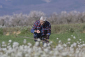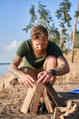 Zrelaksowany dojrzały mężczyzna patrząc na naturę będąc na polu