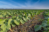rzędy młodych, zielonych, potężnych słoneczników, czystych od chorób, chwastów i owadów, na niebie