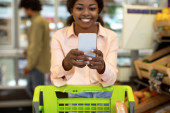African Female Lady Holding Cellphone robi zakupy spożywcze w supermarkecie