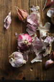Świeże dojrzałe ząbki czosnku na zardzewiałym metalowym tle, z bliska. Trendy twarde światło, ciemny cień, płaski leżak, widok z góry