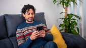 Zdjęcie "Portret białego mężczyzny używającego smartfona leżącego na kanapie w pięknym domowym wnętrzu. Kaukaski mężczyzna sprawdza urządzenie telefoniczne na kanapie domu." może być wykorzystywane do celów osobistych i komercyjnych zgodnie z warunkami zakupionej licencji Royalty-free. Obraz jest dostępny do pobrania w jakości wysokiej rozdzielczości do 5760x3840.