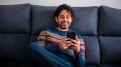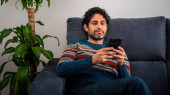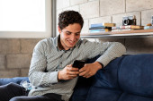 Zdjęcie "Portret szczęśliwego mężczyzny pijącego poranną kawę ekspresową podczas relaksu na kanapie i uśmiechu. wesoły biały facet mając kawiarnia i czując się pewnie w a sofa dom" może być wykorzystywane do celów osobistych i komercyjnych zgodnie z warunkami zakupionej licencji Royalty-free. Obraz jest dostępny do pobrania w jakości wysokiej rozdzielczości do 5760x3840.