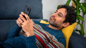 Portret fajnego i przystojnego mężczyzny pijącego poranną kawę ekspresową i siedzącego na kanapie we wnętrzu domu. Człowiek odpoczywa i odwraca wzrok..