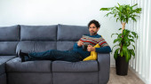 Zdjęcie "Portret fajnego i przystojnego mężczyzny pijącego poranną kawę ekspresową i siedzącego na kanapie we wnętrzu domu. Człowiek odpoczywa i odwraca wzrok.." może być wykorzystywane do celów osobistych i komercyjnych zgodnie z warunkami zakupionej licencji Royalty-free. Obraz jest dostępny do pobrania w jakości wysokiej rozdzielczości do 5760x3840.