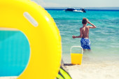 Akcesoria plażowe i krzesło na plaży i zabawy dzieci. koncepcja lato wakacje.