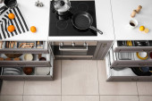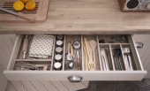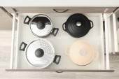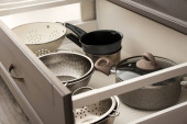 Zestaw naczyń kuchennych w otwartej szufladzie, zbliżenie
