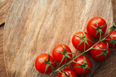 Składniki Pomidory wiśniowe na desce rozkroju tło drewna