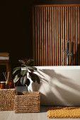 Zdjęcie "Stylowe wnętrze łazienki z zielonych roślin. Projektowanie domu" może być wykorzystywane do celów osobistych i komercyjnych zgodnie z warunkami zakupionej licencji Royalty-free. Obraz jest dostępny do pobrania w jakości wysokiej rozdzielczości do 5760x3840.