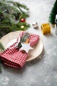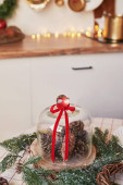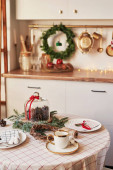 Świąteczna kuchnia i stół. Czerwony, zielony i biały wystrój choinki tle. Święto Nowego Roku. Wesołych Świąt i Szczęśliwego Nowego Roku