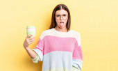 wesoła kobieta z warkoczami w żółtym swetrze pije niebieskie tło