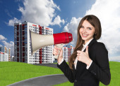 agent nieruchomości z kluczem stoi na ulicy przed nowoczesne bui