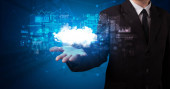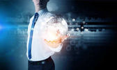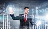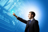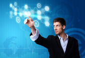 mężczyzna naciskając nowoczesne dotknąć guziki ekranowe z niebieski technologia