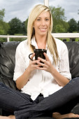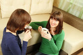 młoda kobieta, picia kawy i rozmawia przez telefon