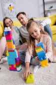 Dziecko bawiące się zabawkami w pobliżu rozmytych rodziców w salonie