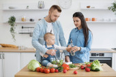 Zdjęcie "Szczęśliwa kobieta trzyma sok pomarańczowy w pobliżu syna i męża cięcia warzyw w kuchni " może być wykorzystywane do celów osobistych i komercyjnych zgodnie z warunkami zakupionej licencji Royalty-free. Obraz jest dostępny do pobrania w jakości wysokiej rozdzielczości do 5760x3840.