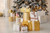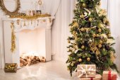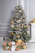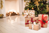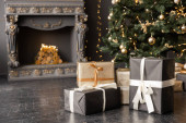 Boże Narodzenie wnętrza. magiczne drzewo świecące, kominek i prezenty