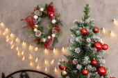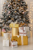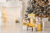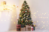 Boże Narodzenie wnętrza. magiczne drzewo świecące, kominek i prezenty