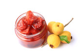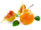 Szklany słoik smacznego dżemu gruszkowego na białym tle
