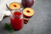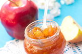 Szklany słoik smacznego dżemu gruszkowego na stole