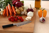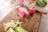 Wegetariańskie jedzenie Składniki dla zdrowej sałatki warzywnej, zbliżenie na desce do krojenia