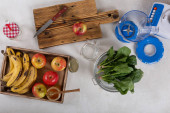 Składniki koktajl owocowy ze szpinakiem na stole z bliska. Banany, jabłka, szpinak, miód