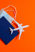 Koncepcja podróży i wakacji. Akcesoria i przedmioty turystyczne. Samolot zabawka nad paszportem z bilety lotnicze i maski twarzy. Widok z góry płaski leżał z miejsca kopiowania