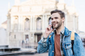 Portret młodego kuriera siedzącego na rowerze i rozmawiającego emocjonalnie przez telefon. Ma żółty plecak na ramionach..