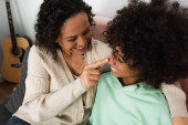 Afrykańska amerykanka ze smartfonem robiącym zdjęcia córce grającej na gitarze w domu