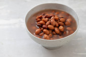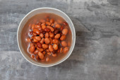 gotowana czerwona fasola w małej białej misce na czerwonym papierze