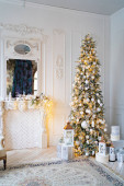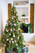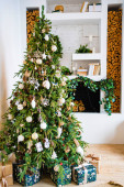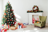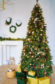 duża choinka z pudełkami prezentów przy dekoracyjnym kominku