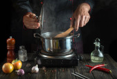 Kucharz gotuje pierogi mięsne w rondlu w kuchni restauracji. Zbliżenie rąk kucharza podczas pracy. Wolna przestrzeń reklamowa.