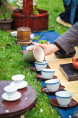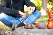 Biały człowiek trzyma ręcznie robiony ceramiczny dzbanek do herbaty z zestawem herbaty na pniu w parku miejskim