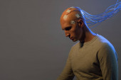 Młody człowiek z głową zaplątaną w druty, chwycił się za głowę.,