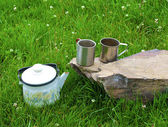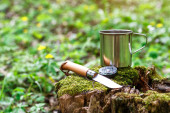 Ciepła filiżanka kawy z ciasteczkiem na kamieniu - koncepcja dzikiego śniadania campingowego