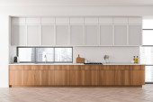 Zdjęcie "Lekkie wnętrze pokoju gotowania z drewnianym tarasem i przyborami kuchennymi, kuchenką, zlewem i mydłem, butelką oleju i łyżkami. Mockup frame menu na stojaku, renderowanie 3D" może być wykorzystywane do celów osobistych i komercyjnych zgodnie z warunkami zakupionej licencji Royalty-free. Obraz jest dostępny do pobrania w jakości wysokiej rozdzielczości do 5760x3840.
