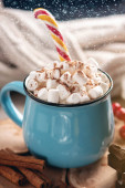 Kubek szklany z gorącym czekoladowym napojem kakaowym z pianką. Odbiór. Mroczne tło. Niski poziom. Zima, Boże Narodzenie i Nowy Rok żywności i picia koncepcji. Skupienie selektywne.