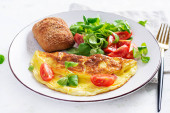 Zdjęcie "Omelette z pomidorami, szynką, serem i sałatką kukurydzianą na talerzu. Frittata - włoski omlet. Widok z góry, nad głową" może być wykorzystywane do celów osobistych i komercyjnych zgodnie z warunkami zakupionej licencji Royalty-free. Obraz jest dostępny do pobrania w jakości wysokiej rozdzielczości do 5760x3840.